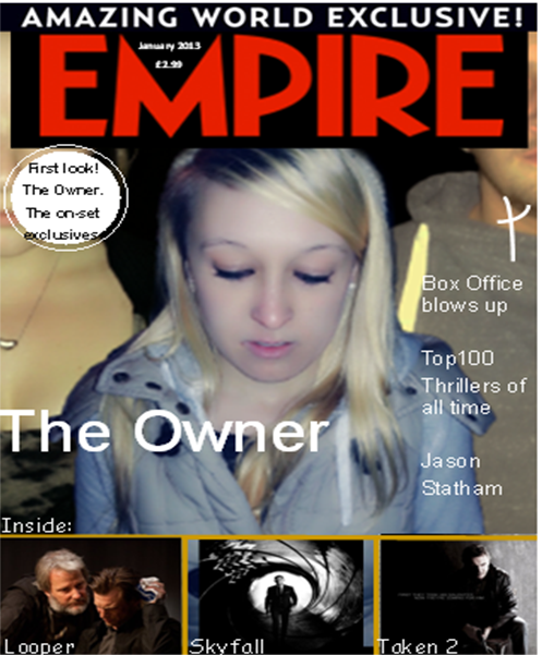 My front cover has similar codes and conventions as any past Empire magazine including the layout, colours and style. I chose to display other thriller films on the cover to explain what the issues contains, this is so the whole issue can relate to my film and the cover can then look similar in genre and therefore similar when comparing the codes and conventions.